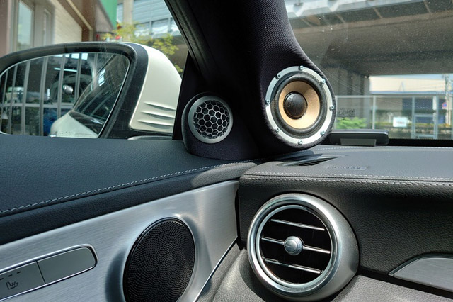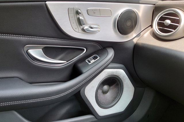 最近の欧州車によくあるのですが、ドアに小口径のスピーカーのみが多い為、大幅な加工が必要ですが、 音質アップの為ドア加工をして、さらに吸音材やデットニングやバッフルの素材をこだわり取付け致しております。