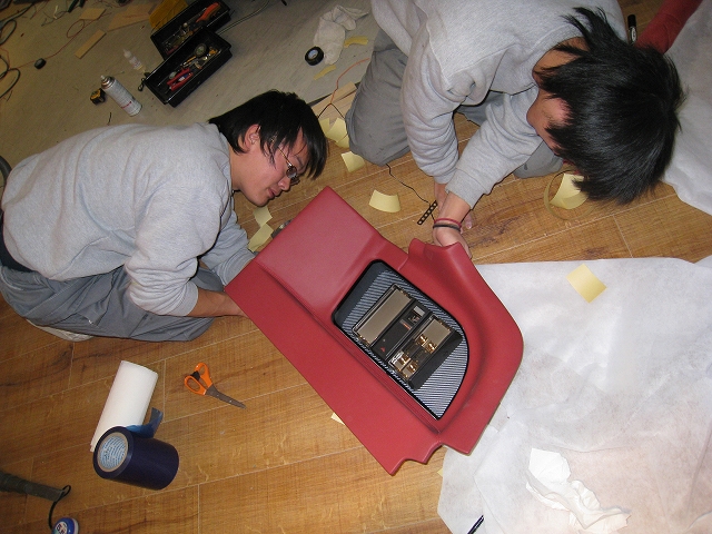 実はこの車の内装の赤、ものすごく落ち着いた赤で、想像と違い、シルバーが浮き気味・・・そこで、パネルをブラックで塗装、綺麗なピアノフィニッシュに生まれ変わりました。これでずいぶんしまった感じでOKです。これに伴い、その他細かいパーツも黒に変更です!