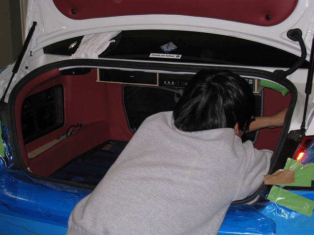 右側が・・・、(岩 削れ削れ!いまさら変更なんかできへんでー!)かなりぎりぎりまで削り込んで、(隊 うーん入りそうです!!)(一同 やったー)こんな局面で、デザイン変更になれば、まず間違いなく、納期は間に合わず、オートサロンはエアロなしになるとこや・・・(岩 この後は植えちゃんが、カーボンのフロントにリヤの羽に、トランクスポイラーまで、確実に仕上げてくれるよ)だって、植えちゃんやもん!