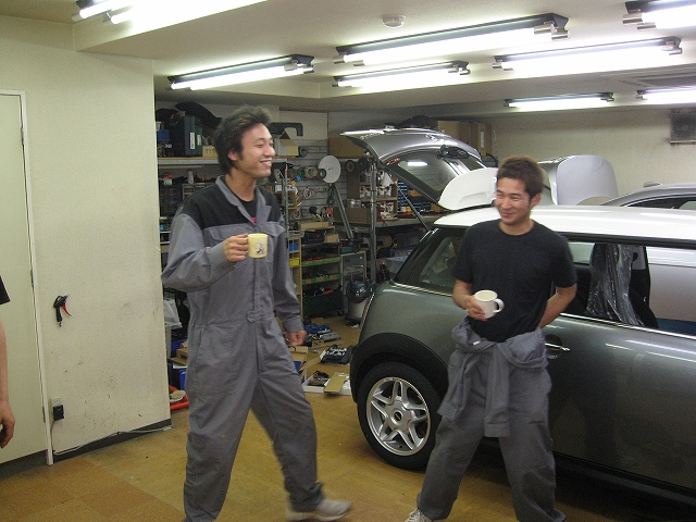 こつこつとプジョーを仕上げています、遅いなーとか、何してんねんとか、何でわからへんねんとか、厳しい言葉を浴びながら、少しずつ成長しています。曽川さんのマスタングを任されることになり、少しずつ、上手になっています。店長、師匠、ドンちゃん、村田君も隊長のマスタング計画には非常にやさしいまなざしを送っています?