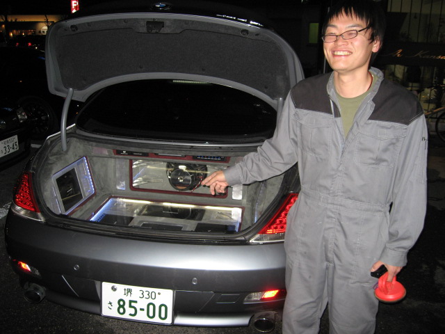 月曜日の夜まで、トランクのカバーは何にも無かったのに!神戸チームが朝まで手伝ってくれて、完成!このスピードと、手際のよさに隊長のめがねが・・・