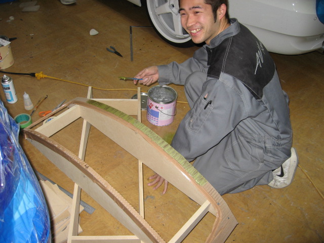 そんなにニヤニヤしながら仕事してんの?そんなにオーナーがエンブレムに名前入れてくれたのが、うれしいん?ドン(違いますよ、ニヤニヤしてないですよ)してるやん、お前さてはまた、へんな想像しながら仕事してるやろ!そんな事してたら、トランクがエロい形になるやないか!ドン(だってこれ曲面を多用でしょ)そうか、それでー変な想像ーいい仕事ー嬉しそうな顔やねんな!