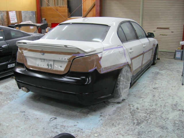 やっとこさですが、これでほとんど完成です、次はこのへこんだ部分に綺麗に収まるディフューザーの製作です(カーボン製)、いつものごとくツッチーとああでもない、こうでもないいいながら、製作しています。もちろんうえちゃんや、橋本君も大活躍です。E60のかっこいいリヤバンパーないなー、みんなごちゃごちゃしてるなー、と嘆いていた皆さん、もうすぐデビューですよ!