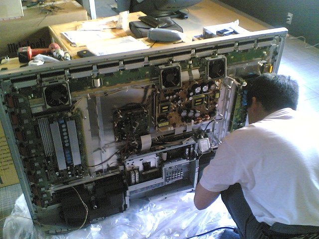 最近はホームでも付く様に、使えるように分解します。これはお客様がシアターシステムを起動するまでもなくTVが見たい時に、あまりにも純正のスピーカーがしょぼいので、ミニポッドにつないでほしい、とのご希望でしたので、このように加工して配線を引きずり出しました、もともとマルチ配線でしたがその辺は余裕です。