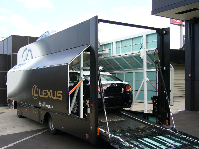 本当にこんな感じで積車からおろされているのでした、当社の車はGS350の黒です。