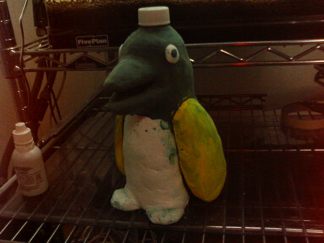 うちの息子が、小学校で宿題の貯金箱を作るのを、手伝えと言ってきました、ちなみにその日の明け方まで、カブトムシを取りに奈良までいっていましたので(勿論子供付で)眠かったのですが、一応、(造ってみ!見といたるから)と言って子供が作業開始、なんでも怪獣だそうです。しかし、見るからにバランスが悪く、これは怪獣にしてはバランスが悪いやろー(^^)と言う事で、僕がかってにペンギンに変更、この後子供が絵の具で、とても汚く黒く塗っていました。個人的には、口がもう少し小さければ、丁度いいペンギンになったと思うのですが(^^)ココは子供の製作なので撤去できませんでした。小さい頃から、デザインやバランスにはこだわる子供にしたいですね。(育て方間違ってるかな?)