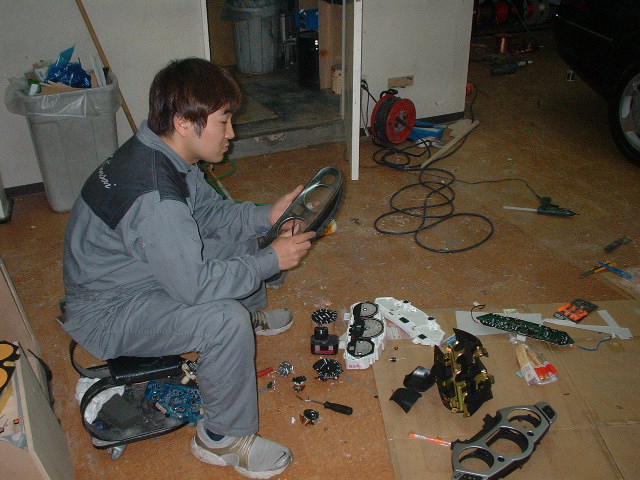 今度はピット長の東が自分の車を考えています、ムラーノのメーターを作り直そうと考えています。みんなこのイスに座って何故か?考えます。しかし、まぁー新車のムラーノのメーターを、こんなにばらして良いのでしょうか?みんなが出来ない事をしたいそうです。ちなみに僕は(やめといたらー)と言いましたが(^^)やめないそうです。よーやるわーほんまに(^^)でもなんで、こんなすねた顔?