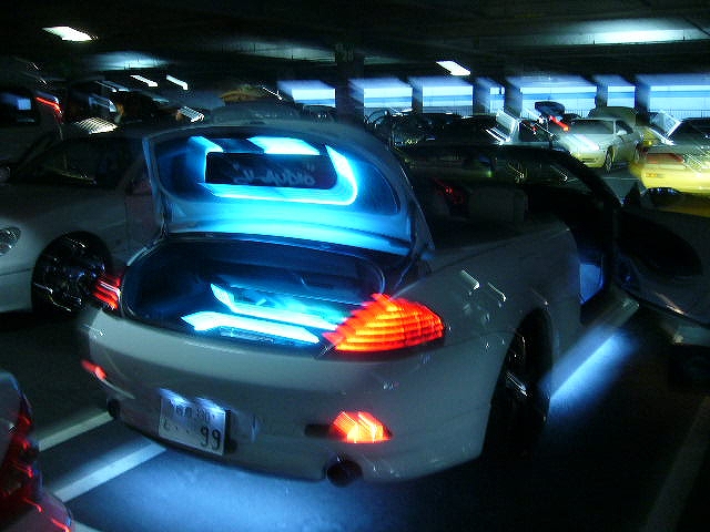 なんだか少し怪しいムードの駐車場でのオフ会みたいな感じですが怪しい車も多かったので、ネオン搭載車輌には好都合でした。