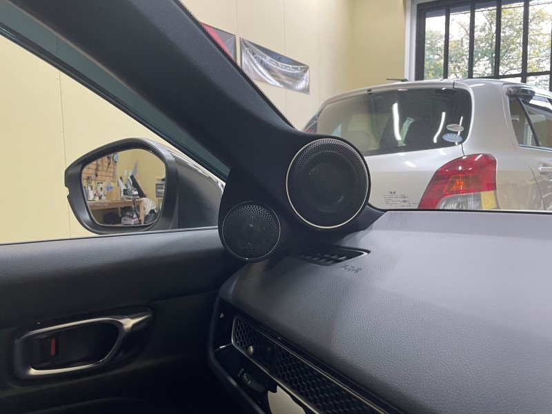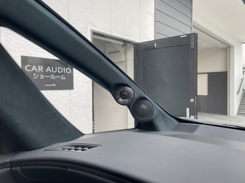 ピラーとミラー裏にそれぞれ加工取り付け、ドアはアウターバッフルにて
