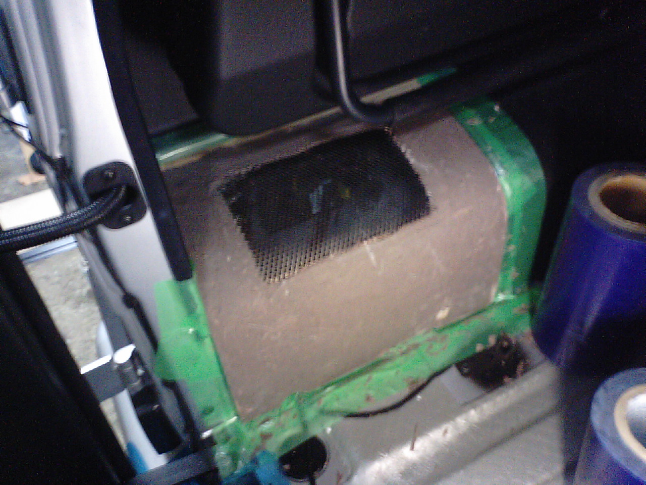 ここにSWを埋め込む作戦にでました。μ8インチなんで、何とかなります。黒いのはパンチングをグニュって曲げて一体化。最後はカーペット仕上げでSWの存在感ゼロ!