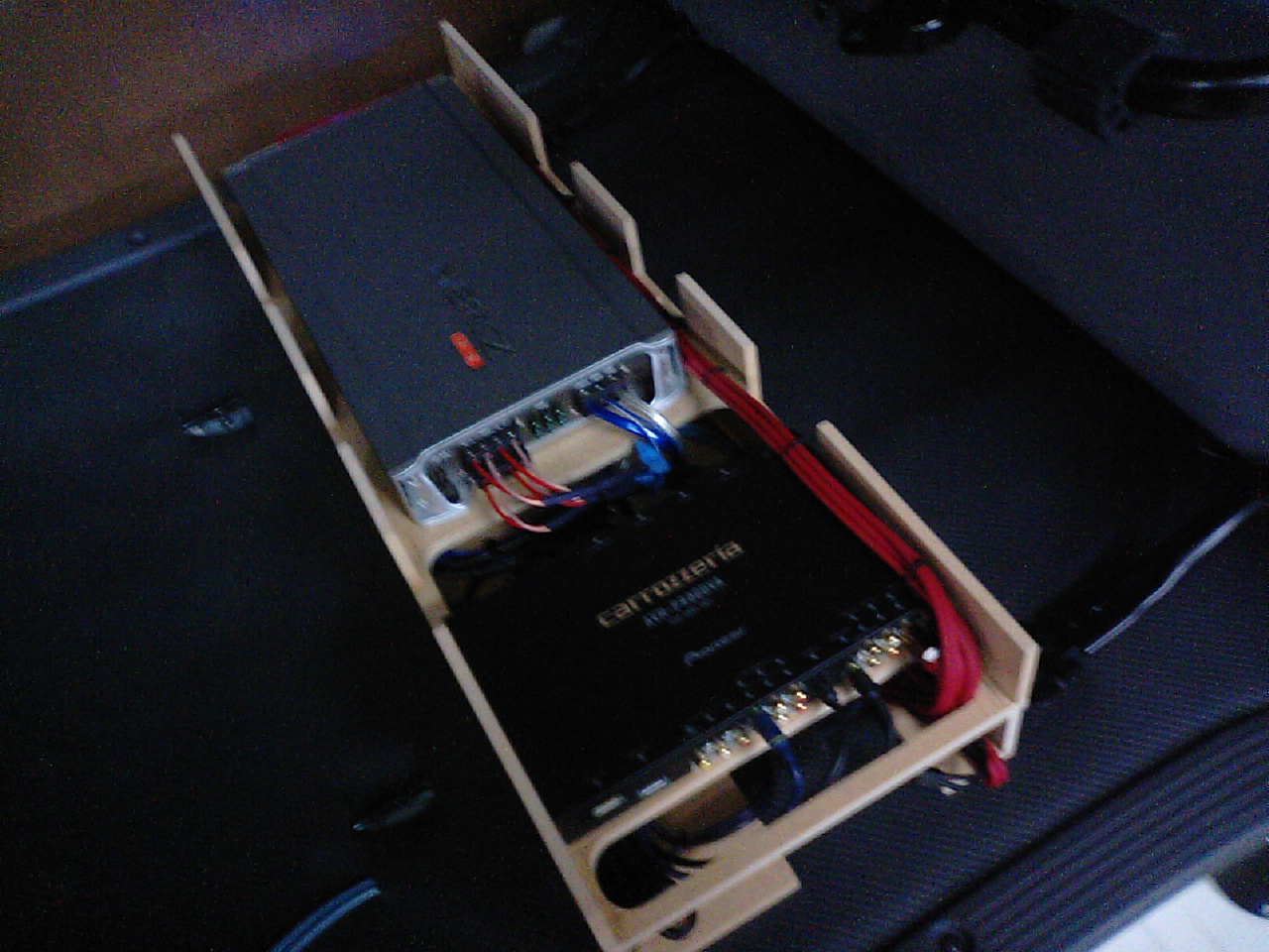 アンプやら、ハイダウェイやらはシートの下に箱を作って固定!