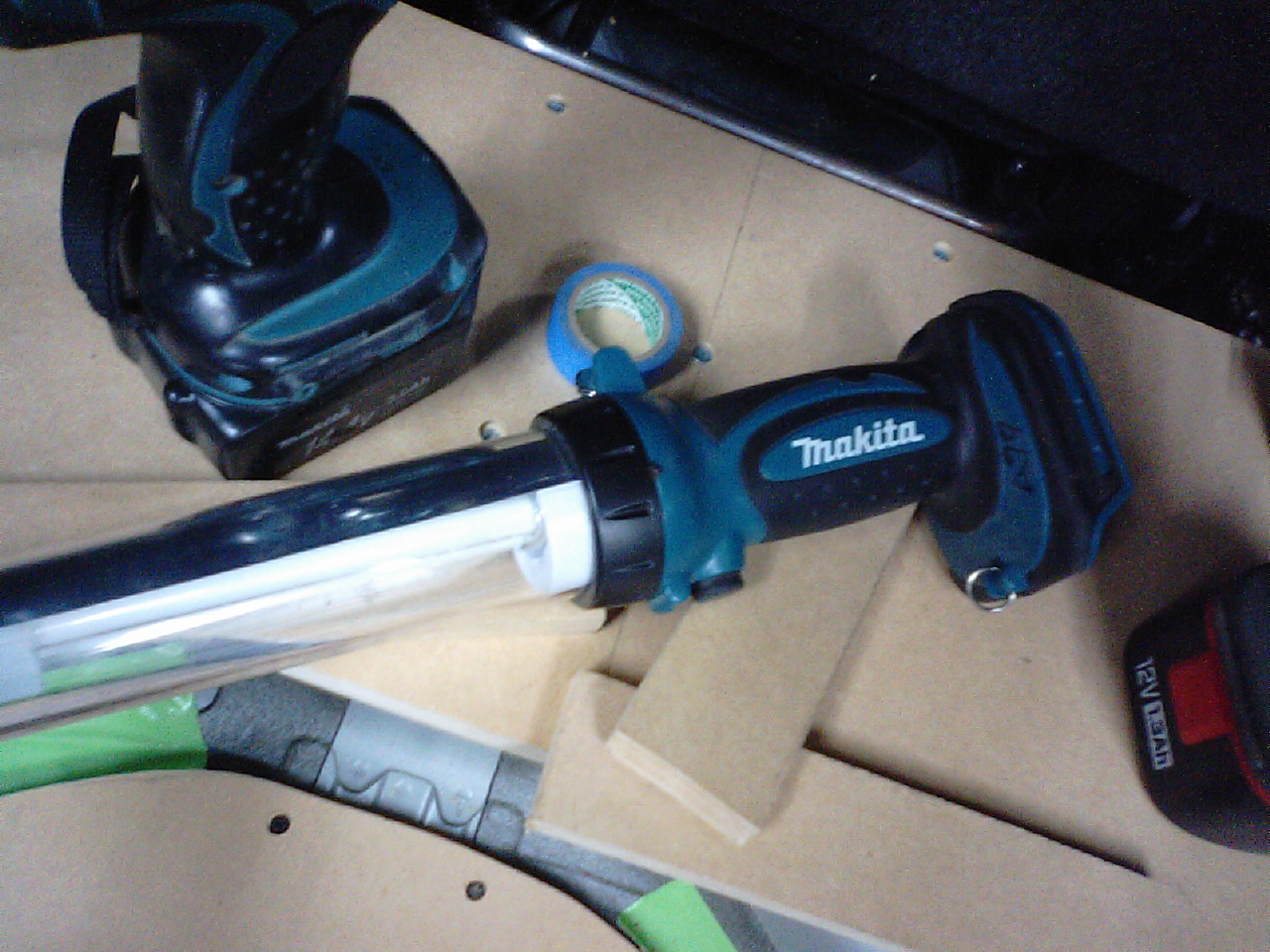 インパクトの電池を共有できる、なんていい商品なんでしょう!このライトめちゃ明るいし、先には電球付いてて、配線いらずのスグレ物!これ僕のオススメ!
