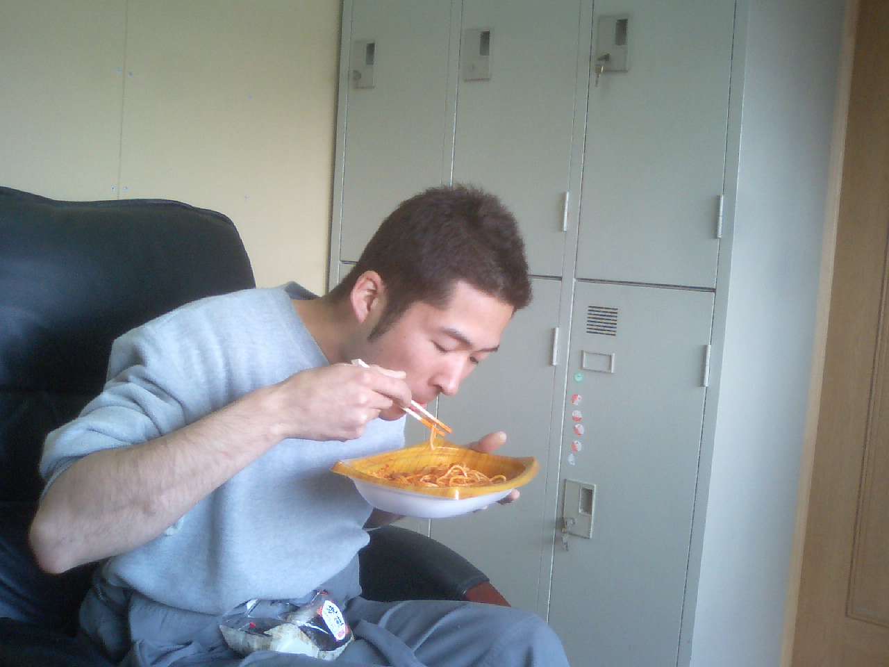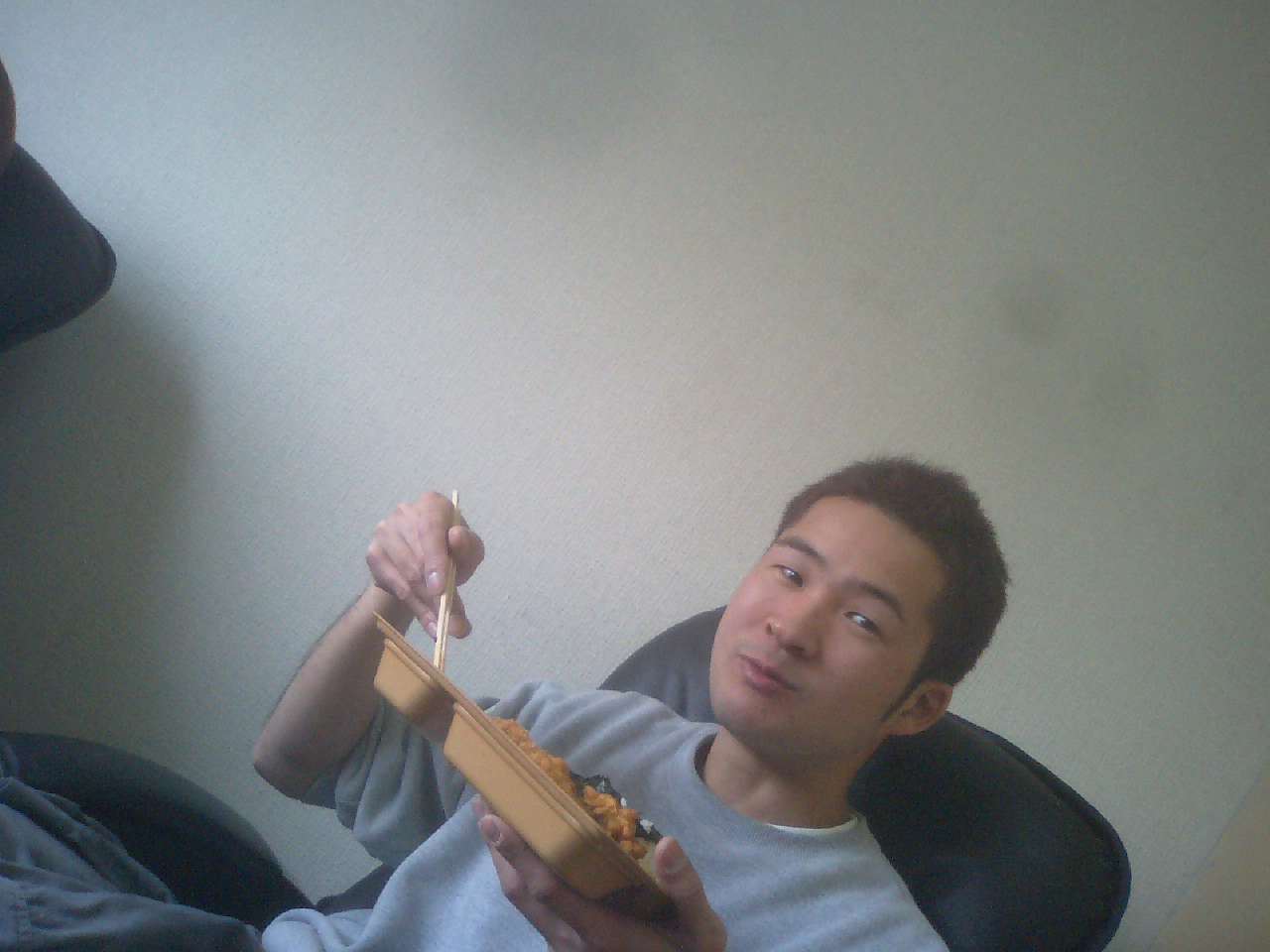 今日からまたDの観察日記が始まりました。今日は僕も弁当がなかったので、一緒にかまどやへ行きました。3月27日のDの昼飯は[紅鮭弁当のごはん大盛り」で決まり!そして50円割引き券を使い勘定をすまし、信号が青の点滅になったのでダッシュでお持ち帰りしました。蓋を開けてまず最初に箸が向かったのは、メインの紅鮭!身にせず、骨にビビることなく小さい口で一気にかぶりついてしまいました。せっかくの紅鮭を味わって食べればいいもののこの時ばかりは食べたモン勝ちのようです!次は大盛りごはんを少しずつ食べながら、その他のおかずをほうばり、あまり噛まずに、時折お茶で無理やり流し込む、強引さはDの男らしさを感じました。それと「そないあせってくわんでも・・・」とのどにつまらないか心配になる自分がいて、ちょっと間直視してしまいました。まぁ食べ終わった後は、いつものお昼寝ですね。寝る前に1回必ず鼻を吸い込み、ガーと言わせた後、手を後ろに組み、寝ます。たまに寝ながら屁をこいだりする余裕を見せたりしますが、今日は僕も寝たので、どうだったかはわかりませんが、多分こいだと思います。ではまた明日のDをお楽しみに!