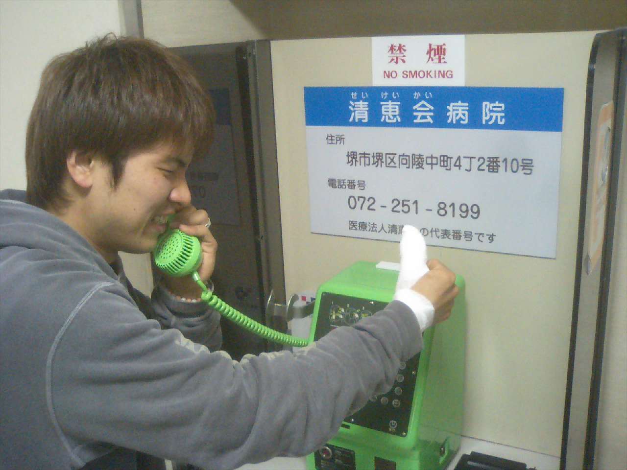 今日はバタバタした1日でした。11時過ぎに仕事を終えたんですけど、それから30分後にいつも音を鳴らさないようにしている僕の携帯にミスターfから電話が!玉玉携帯が光っていたので「ん~なんか電話か~」と気づいて見てみるとミスターfが「とにかく早く出て」と念を送ってきたので無視せずにでたら「食器と格闘して親指やられたから病院つれって!血が止まんないのだ」という電話が!「わかった!迎えに行くから家でまっとって!」すぐに飛び出して、救急病院をさがしながらミスターの館へレッツゴー!「よう考えたら、館って1回、館の下へ行っただけでなんやほっそい道入ってあんま覚えてへんな~、まぁなんとかなるか!」と勢いよくでたは良かったものの、案の定迷って、しまいにミスターfは迷いのムラーノを見つけ歩いてやってきました。見つかって良かったです。早速救急病院へ向かって、親指に赤チン塗ってもらって出来上がり。「縫うてもらいって!注射痛いから!」でもミスターfは赤チンにぐるぐる包帯巻きですましちゃいました~ でも「痛い痛い痛い」「血怖い」「もう京都行かれへん」「村田さんのネタにつかわれる~」「どうやって生きていったらええんや」「あ~お先真っ暗」「ほんま誰か助けて~」とつぶやきながら、ちゃかりナイスショットで締めくくりました。本人元気です