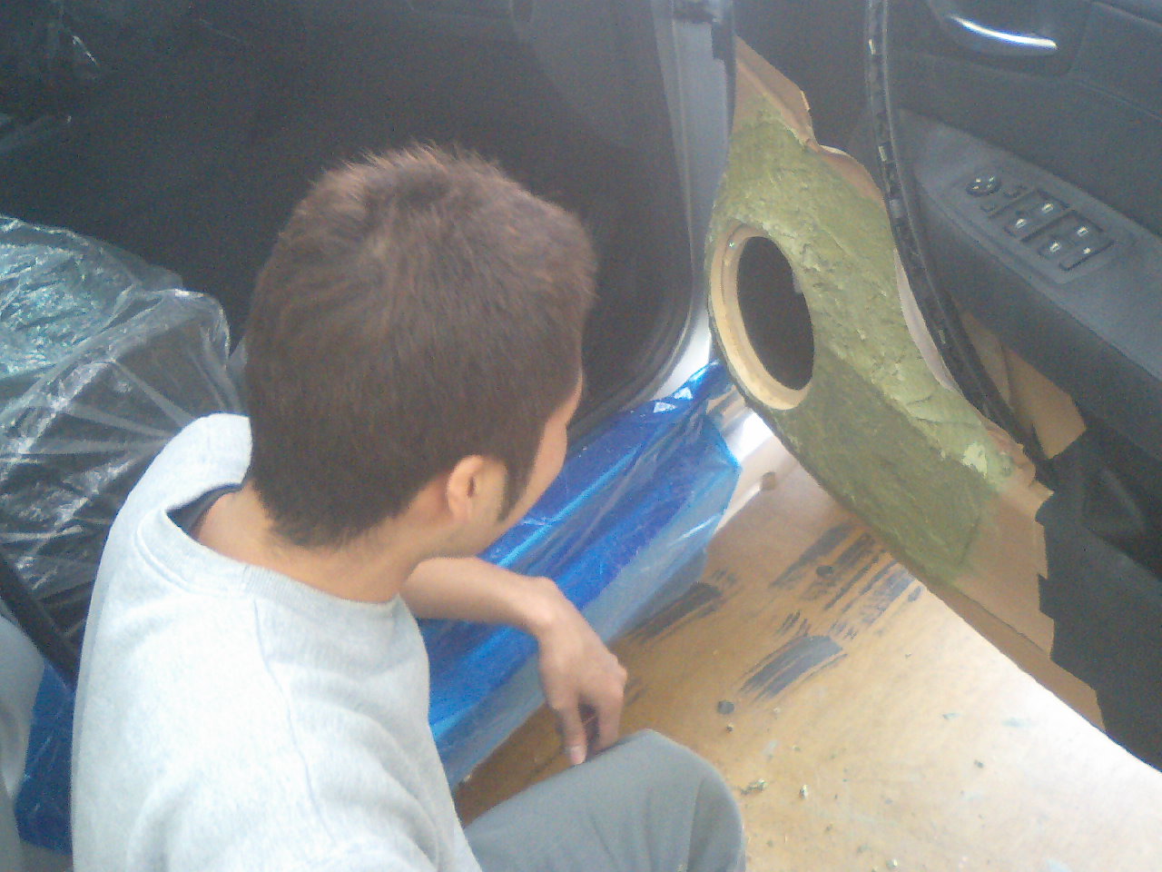 トゥアレグの最終仕上げに入りました。後はラゲッジ横にSWとアンプラックを製作して出来上がりです。追加でSPグリルをピアノブラックで塗装し、アウターパネルも出来上がっていましたが、色合わせのため、レザーをダークグレーにて巻きなおし、質感を高めます。サラウンドバックSP取り付け部は後方視界の邪魔にならないように、極限までコンパクトに仕上げました。仕上がりが楽しみな1台です。