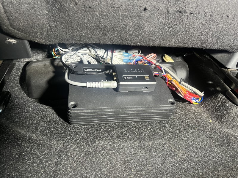 ロールバー組みなレーシーな車輌だけに作業が困難ではありますが、そこをうまく回避しながらも現在お使いのパイオニアスピーカーとパワードウーファーを設置を見直し、新たにDSPとBluetoothコンバーターを追加、リモコンも取付けてサクッとシステムアップしたものの音は激変でしたw