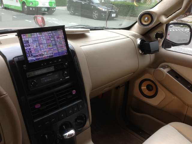 このエクスプローラーは元のスピーカー位置が比較的高い位置にあり、ドア加工とTWはミラー裏にマウント製作しての取り付け。