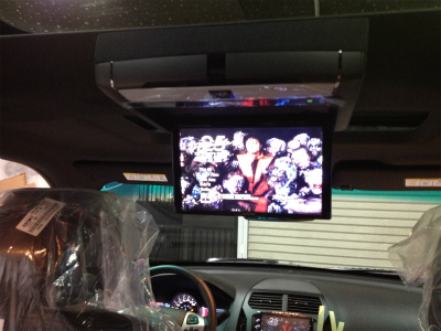 ガラスルーフのexplorerへフリップダウンモニターの取付け。