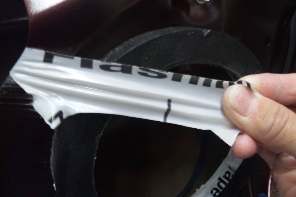 このテープの最大の特徴がめちゃくちゃ伸びた上に、超強力接着ノリが使用されているので、インナーバッフルを固定した上からこのテープを数枚に分けて、SPを付ける穴の側面からインナーパネルの裏側へ貼っていきます。