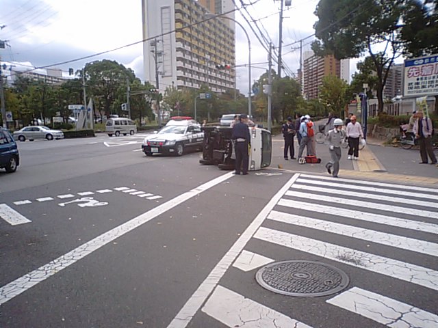 しかし、なにか起こるともう一個なんかある。結局スペア待ちで、公園に一人たそがれていましたが、なんか騒がしくなってきたので、覗いてみると交差点で車がひっくり返ってました。