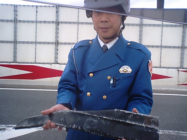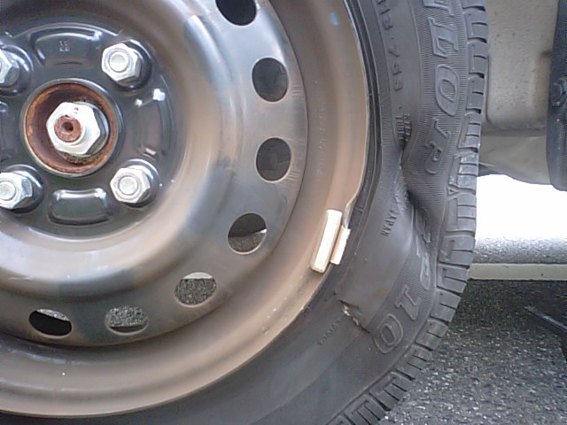 実は追い越し車線を走行中に、前の車がよけて飛んで来た3つの物体のうちの一つがタイヤにヒットしたらしく、バーストしちゃったんです。