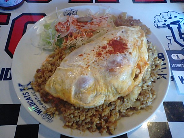 ドライカレーの上にオムレツがのって横にはサラダ付き。といっても感動が伝わらないので、もう少し細かく書くと、オムレツにはトローリチーズにスパニッシュソースが入っていて、コレを割ってドライカレーと一緒に食べる!ほんでちょっと辛いと思ったらサラダ食うみたいな食い方してますが、基本食べ方は自由です。