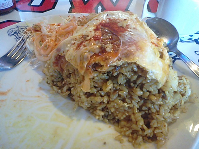 やっぱりベースのドライカレー!これがかなりウマイんです!オムレツチーズにピリッと辛いが最高にマッチして絶対また食べたくなるのですが、おなかがすぐ一杯になる人は食べ終わったら「うまいけどちょっとの間ええわ~」になります。食いかけ写真がそれを物語ってますが、僕は全く平気です