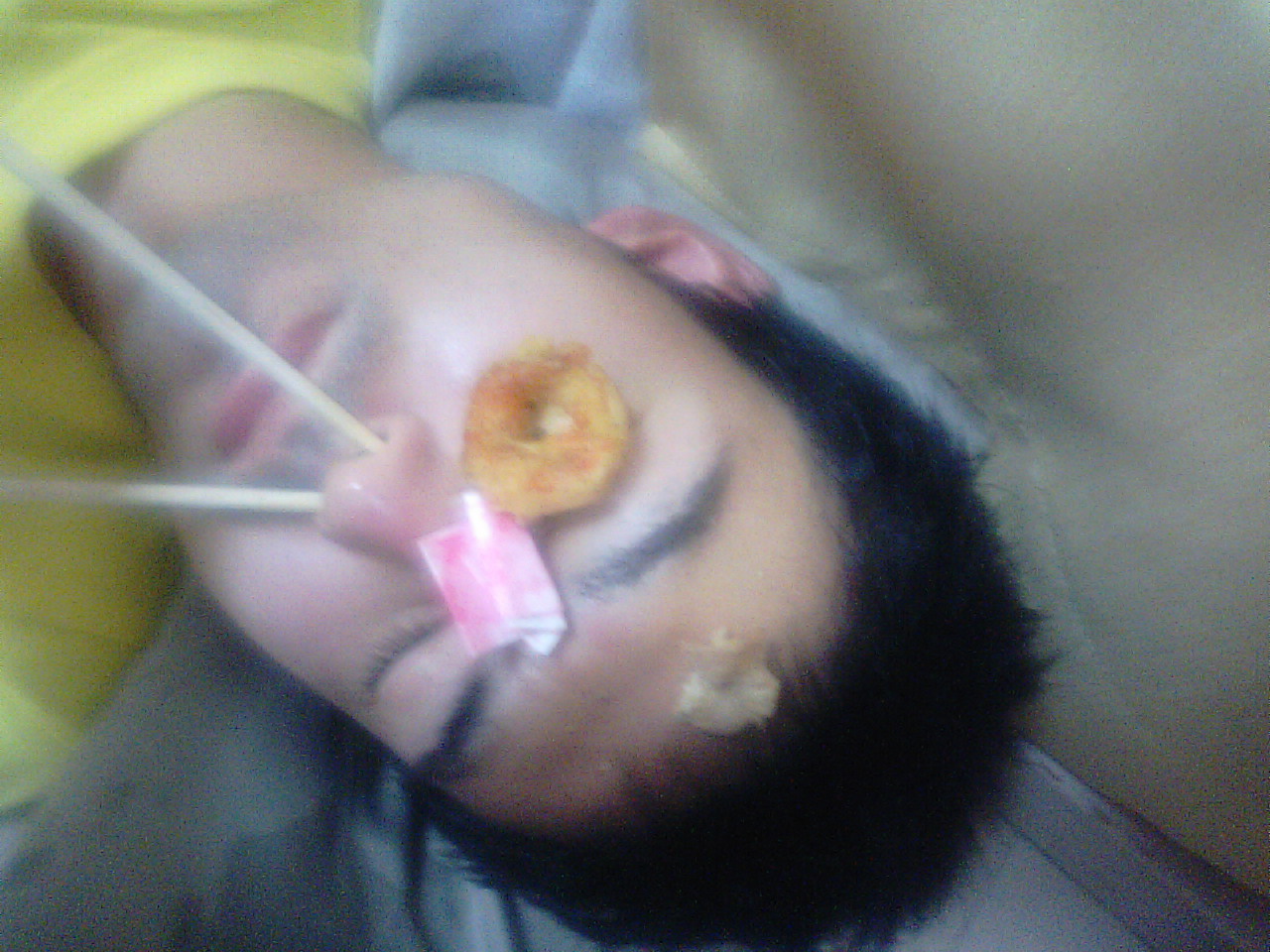 顔には無数の高級食材と、気の優しいHG様と心配症なボクが、「これ明日二日酔いしたらアカンなぁ~」と思い、無理やり口の中一杯に放り込んだ極上のウコン。割り箸は飲みすぎた先生が心配でたまらないボクとHG様で、鼻詰まりで息が出来なくなると思い鼻の通りを良くしておきました。